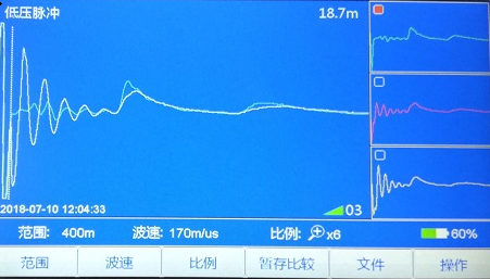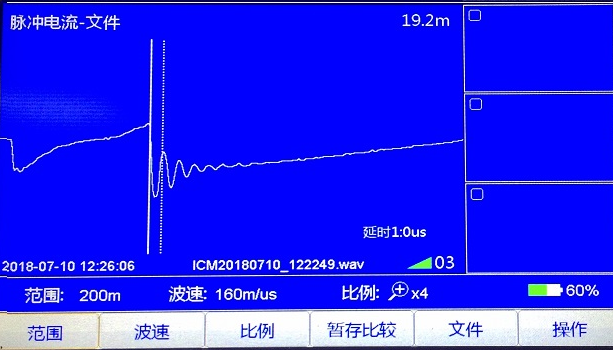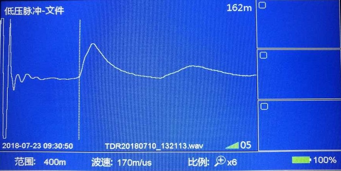 3、用低壓脈沖測試,電纜全長為162米。相間對比在18米左右波形不匹配。用脈沖電流測距,紅相對零線,電壓5KV擊穿,波形顯示故障在距測試端18.7米左右,在配電室南面的綠化帶定位,聽到放電聲。